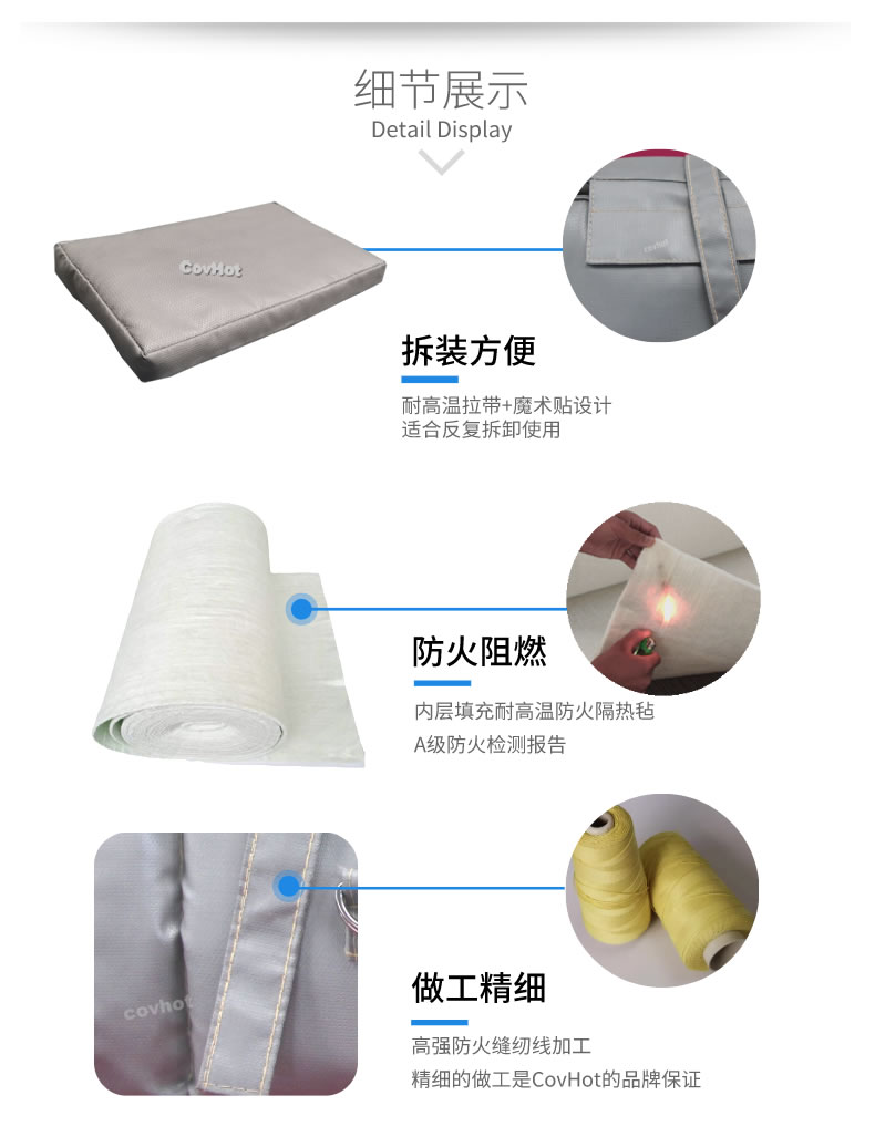 可拆式保溫套保溫效果好,拆裝方便,易于日常維護保養,能反復使用,對環境無污染,與人體接觸后不刺激皮膚。根據現場的物料產生火災的可能性、火災的預期溫度、救火需要的時間等綜合考慮,設計適應不同的溫度、耐火時間,從而達到經濟、合適的防火效果。